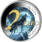 Die Vorderseite dieser prägefrischen Münze zeigt ein wahrhaft spektakuläres Bild: Ein majestätischer Wolf steht auf einem schneebedeckten Felsen und heult den Vollmond an. Die Szenerie ist in mystischen Blautönen gehalten, während der Mond im Hintergrund eine fast magische Atmosphäre schafft. Die goldene "2" und der Schriftzug "EURO" setzen einen eleganten Kontrast zur winterlichen Farbpalette. Kleine Sterne umrahmen das Motiv und verleihen der Münze zusätzliche Tiefe.