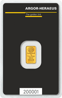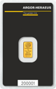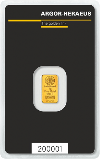 Dieser Goldbarren ist mit dem Logo des Unternehmens Argor Heraeus geprägt. Des Weiteren wird angegeben, dass der Barren in der Schweiz hergestellt wurde und zu 99,9 % aus reinem Gold besteht.