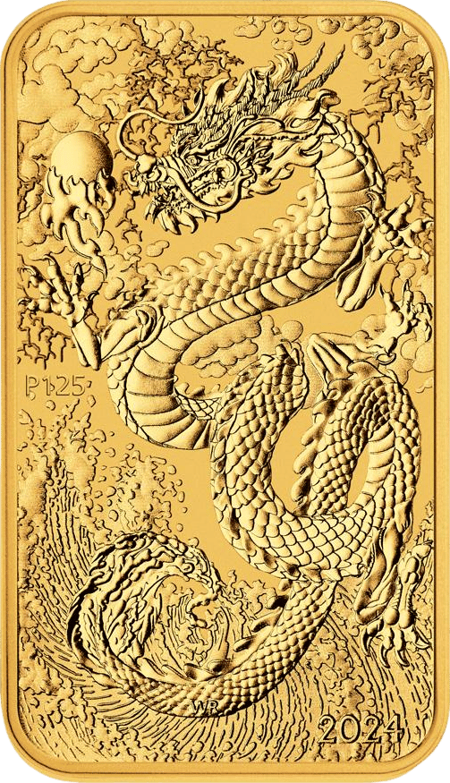 Die Motivseite des Barrens zeigt einen orientalischen Drachen, der eine flammende Perle betrachtet – ein Symbol der Weisheit. Der Hintergrund ist mit Wasser und Wolken verziert, die als Glücksbringer gelten. Die Inschrift „2024“ und das Münzzeichen „P125“ weisen auf das 125-jährige Bestehen der Perth Mint hin.