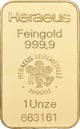Die Rückseite ist mit Heraeus-Logo geprägt. Es wird außerdem angegeben, dass der Barren aus 99,99 % reinem Gold gefertigt wurde und die Stückelung 1 Unze beträgt. Auffallend ist auch die Barrennummer, die auf keinem Fall von der Nummer abweichen sollte, die sich auf dem dazugehörigen Echtheitszertifikat befindet. Damit haben Sie die Gewissheit, dass es sich bei diesem Produkt um ein Original-Produkt handelt.