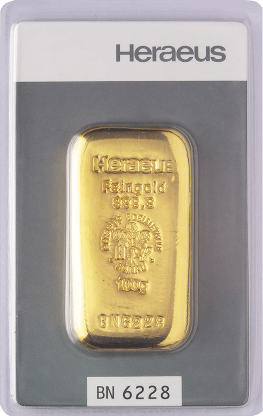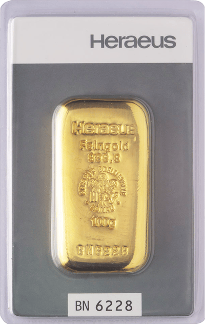 100 g Goldbarren Heraeus (gegossen)