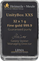Die UnityBar Goldbarren von Heimerle und Meule stehen für höchste deutsche Handwerkskunst. Mit einem Feingewicht von 32 Gramm und einer Feinheit von 999,9/1.000 repräsentieren sie die Spitze der Reinheit und Qualität im Bereich der Edelmetalle. Jeder der 32 Barren ist prägefrisch und trägt stolz die Prägung "FINE GOLD 999.9" sowie das Gewicht von "1g".