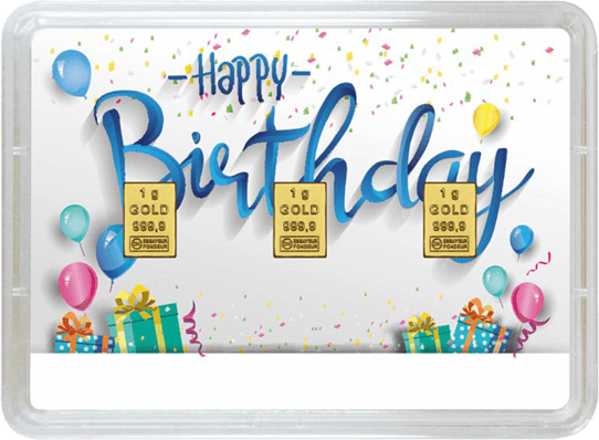 Geschenke bekommt eigentlich jeder gerne. Warum nicht also etwas Schenken, das zeitlos ist, schön aussieht und auch noch funktional ist? Das Happy-Birthday Geschenkset besteht aus 3x 1g Goldbarren. Auf der Vorderseite der Barren sind die Angaben „1g“, „GOLD“, „999,9“ und „ESSAYEUR FONDEUR“. Die Vorder- und Rückseite des Blisters sind bunt mit klassischem „Happy Birthday“-Schriftzug verziert. Hinzu kommen stimmungsmachende Konfetti, Luftballons und Geschenke. Bei dem Valcambi Geschenkbarren handelt es sich um Neuware.