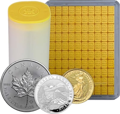 - Paketinhalt: 500 x 1/4 Unze Silber Arche Noah, 100 x 1 Unze Silber Maple Leaf, 30 x 1/10 Unze Gold Britannia, 2 x 50 g Gold Tafelbarren Combibarren (Goldplättchen)