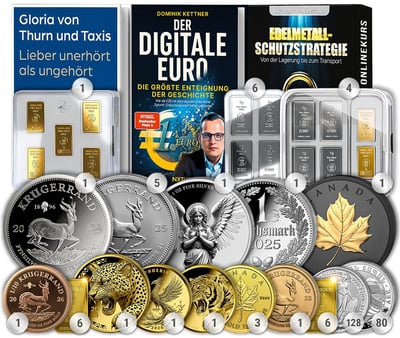 Zusätzliche Gratiszugaben: Zwei handsignierte Bücher von Dominik Kettner und Prof. Dr. Werner Patzelt, ultra-limitierte Sammlerausgaben in polierter Platte mit Auflagen von nur 299-5.000 Stück, professionelle Münzhandschuhe und vier Krisenschutz Boxen