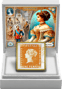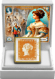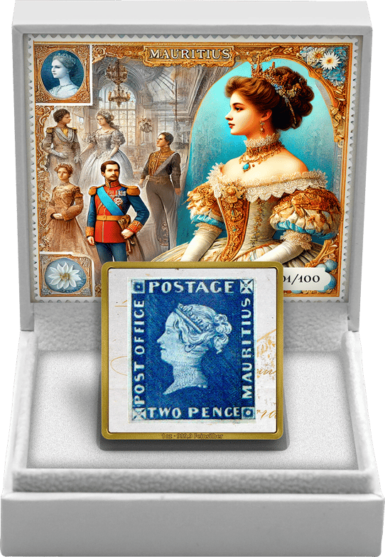 Der quadratische Silberbarren zeigt die beiden berühmtesten Briefmarken der Welt: die Blaue und die Rote Mauritius. Diese legendären Briefmarken sind nicht nur weltweit bekannt, sondern auch bei Sammlern außerordentlich begehrt. Die detailreiche Szene auf der Münze zeigt historisch gekleidete Personen in einem opulenten Innenraum, vermutlich einem Ballsaal. Im Vordergrund steht eine Frau in einem prachtvoll verzierten Kleid mit Gold- und Blautönen, während im Hintergrund weitere Personen in zeitgenössischer Kleidung, darunter ein Mann in einer militärischen Uniform, zu sehen sind. Die lebendige Farbgebung und der gotische Bogenrahmen mit dem Schriftzug "MAURITIUS" verleihen dem Motiv eine besondere Eleganz.