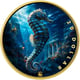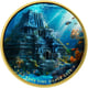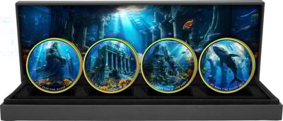 Jede einzelne Münze dieses außergewöhnlichen Sets wurde zunächst vollflächig vergoldet und anschließend mit höchster Präzision koloriert. Die Kombination aus glänzendem Gold und lebendigen Farben erschafft eine atemberaubende Tiefenwirkung, die die versunkene Stadt Atlantis in all ihrer Pracht erstrahlen lässt. Majestätische Meerestiere schweben durch kristallklares Wasser, während im Hintergrund die monumentalen Säulen und Tempel der legendären Zivilisation zu erkennen sind.