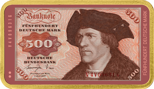 - Motiv: Detailgetreue Nachbildung des legendären 500-DM-Scheins mit historischem Portrait