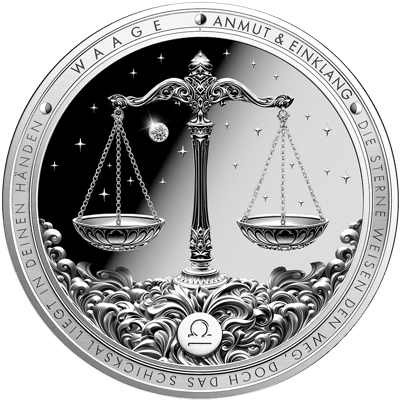 Die Vorderseite dieser Silbermünzen-Rarität besticht durch ihre atemberaubende Detailfülle. Im Zentrum thront eine majestätische Balkenwaage – das klassische Symbol des Sternzeichens Waage. Die beiden ornamental verzierten Waagschalen hängen an filigranen Ketten, die mit höchster Präzision in das edle Metall gearbeitet wurden.