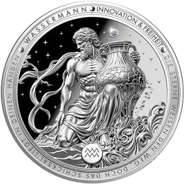 Der tiefschwarze Sternenhimmel im Hintergrund bildet einen faszinierenden Kontrast zum glänzenden Silber. Und dort, wo die Sterne am hellsten funkeln, thront ein echter Diamant – ein Schmuckelement, das diese Münze in eine völlig eigene Liga hebt. Am unteren Rand findet sich das astrologische Symbol des Wassermanns in einem runden Medaillon.