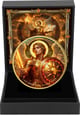 Diese kostbare Münze wird in einer schwarzen Präsentationsbox geliefert, die ihresgleichen sucht. Das Hintergrundbild zeigt den Erzengel Uriel mit brennender Fackel und aufgeschlagenem Buch, umrahmt von einem kunstvollen goldenen Rahmen mit Edelstein-Verzierungen in den Ecken. So wird jedes Stück zu einem wahren Schatzkästchen für Ihre Sammlung.