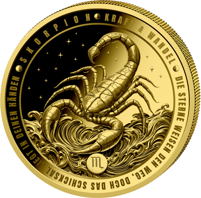 Diese außergewöhnliche Goldmünze aus der beliebten Sternzeichen-Serie vereint astrologische Symbolik mit höchster Prägekunst. Der Skorpion – Zeichen für Kraft, Transformation und Tiefgründigkeit – erhebt sich in atemberaubender Detailtreue über ornamental geschwungene Wellen im Barockstil. Ein Meisterwerk, das jeden Sammler in seinen Bann zieht.