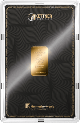 Der Goldbarren präsentiert sich in seiner durchsichtigen Kunststoffkapsel wie ein modernes Kunstwerk. Das markante Kettner-Logo in Gold- und Silbertönen ziert den oberen Rand der Verpackung, während das traditionsreiche Heimerle + Meule Logo am unteren Rand für Vertrauen sorgt. Die Prägung "5 g FINE GOLD 999.9" auf dem Barren selbst ist gestochen scharf und unterstreicht die Reinheit von 999,9/1000 – praktisch reines Gold.