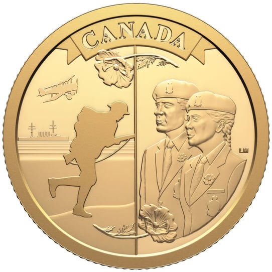 Die Vorderseite dieser Goldmünzen entführt den Betrachter in eine vielschichtige Bildwelt voller Symbolik. Auf der rechten Seite erblicken Sie zwei Soldatenporträts im Profil – einen männlichen und einen weiblichen Veteranen in Militäruniform mit Barett. Beide tragen die ikonischen Mohnblumen, jenes zeitlose Symbol der Erinnerung an gefallene Kameraden. Die weibliche Soldatin mit ihrem geflochtenen Zopf repräsentiert dabei die moderne Diversität der kanadischen Streitkräfte.