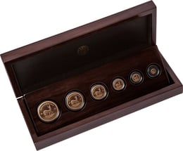 Das elegante Holzetui, in dem die sechs Münzen präsentiert werden, unterstreicht den exklusiven Charakter dieses Sets. Die dunkle Maserung des Holzes bildet einen wunderschönen Kontrast zum warmen Goldton der Münzen. Jede Münze ruht sicher in ihrer eigenen Kapsel – perfekt geschützt für die Ewigkeit.
