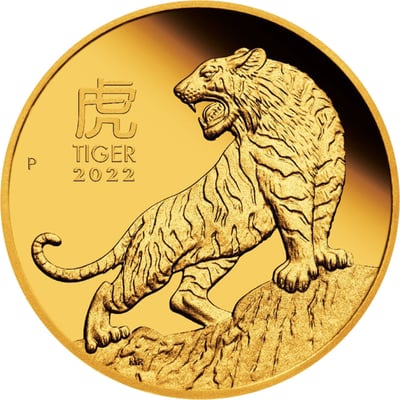 Sie erhalten bei dieser Serie Goldmünzen in einer sehr hohen Prägequalität mit den Merkmalen „Polierte Platte“ und „High Relief“. Gestaltet wurde das Motiv vom Designer Ing Ing Jong. Zu sehen ist ein beeindruckender Tiger, der äußerst realistisch wirkt. Abgebildet sind zudem das chinesische Schriftzeichen für „Tiger“ sowie „Tiger 2022“. Auf der Rückseite befindet sich wie immer Königin Elizabeth II., ergänzt durch den Feinheitsgrad von 999,9, dem Gewicht von 1 Unze sowie den Nennwert von 100 Dollars (AUD).