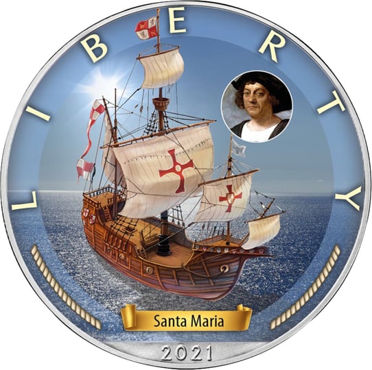 Die Münze ist komplett coloriert und zeigt auf der Vorderseite das Motiv der Santa Maria, das berühmte Schiff von Christoph Kolumbus. Die Rückseite der Münze zeigt das klassische Motiv des American Silver Eagle mit dem Wappen der USA und dem Nennwert von 1 USD. Diese Münze ist ein einzigartiges Stück Geschichte, das in keiner Sammlung fehlen sollte.