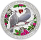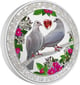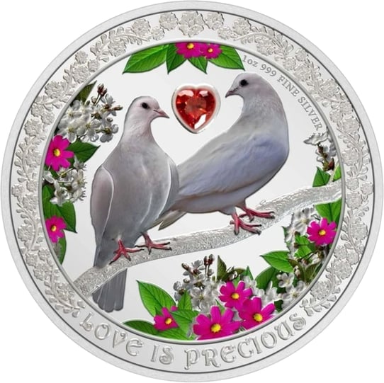 Auf der Vorderseite dieser Münze sehen Sie zwei verliebte Tauben auf einem Ast. In der Mitte der beiden Tauben sehen Sie ein rotes Zirkoniaherz. Die Kolorierung der Tauben, Blätter und Blüten sorgt für eine detailreiche Münzgestaltung. Die Inschrift ist “Love is precious”.