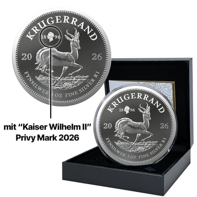 Zögern Sie nicht zu lange! Bei einer derart niedrigen Auflage ist schnelles Handeln gefragt. Sichern Sie sich jetzt Ihr Exemplar dieser außergewöhnlichen Münze und werden Sie Teil einer exklusiven Sammlergemeinschaft. Der 1 Unze Silber Krügerrand Kaiser Wilhelm II. Privy Mark 2026 – wo Tradition auf Innovation trifft und Geschichte greifbar wird.