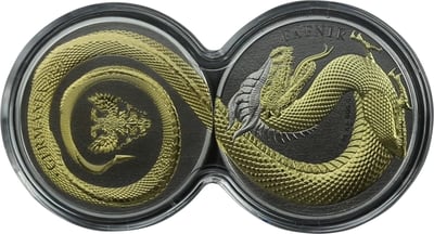 Das Besondere an der Gestaltung der Münze ist, dass das Motiv sich über beide Seiten der Münze erstreckt. Auf der einen Seite sieht man den Kopf des Drachen, sein Körper schlängelt sich über den Rand der Münze auf die andere Seite, wo sich der Rest des Körpers spiralförmig aufrollt bis zur Schwanzspitze. Im Zentrum der Wertseite ist das Wappen der Germania Mint zu sehen, der Nennwert von 5 Mark ist auf dem Körper zu sehen, sowie die Aufschrift Germania 2020. Die sogenannten Flipcoins befinden sich in einer Doppelkapsel, so dass man das ganze Motiv, welches sich auf beide Seiten der Münze erstreckt, sehen kann. Durch die Veredelungen mit Gold und Ruthenium hat man ein wunderbares Farbenspiel, was den Fafnir noch viel besser zur Geltung kommen lässt.