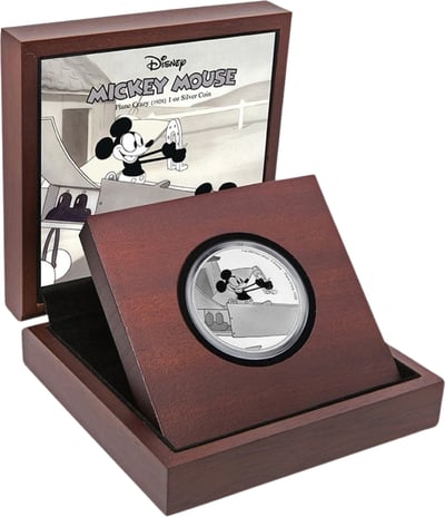 In dieser offiziellen Walt Disney Münzserie “Mickey Through the Ages” werden Film-Szenen aus den vergangenen Jahren abgebildet. Die dritte Ausgabe zeigt einen Moment aus dem Stummfilm „Plane Crazy“ aus dem Jahr 1928.