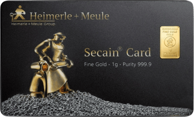 Das Gute ist, dass es sich um Gold vom Feinheitsgehalt 999,9 handelt. In Kombination mit der erstklassigen Verarbeitung entspricht der Wert des Goldbarrens stets dem aktuellen Kurspreis für Gold. Was das Aussehen des 1g Goldbarrens betrifft, weist er den Namen Heimerle + Meule auf. Darunter finden sich „FINE GOLD“ und „999,9“. Mittig ist das Logo inklusive des Goldgießers und der Jahreszahl 1845 zu sehen. Darunter stehen das Gewicht von „1g“ und „melter assayer“. Auf dem Blister der Secain Card finden sich ebenfalls die Angaben zum 1g Goldbarren sowie die eindeutige Zertifikatsnummer.